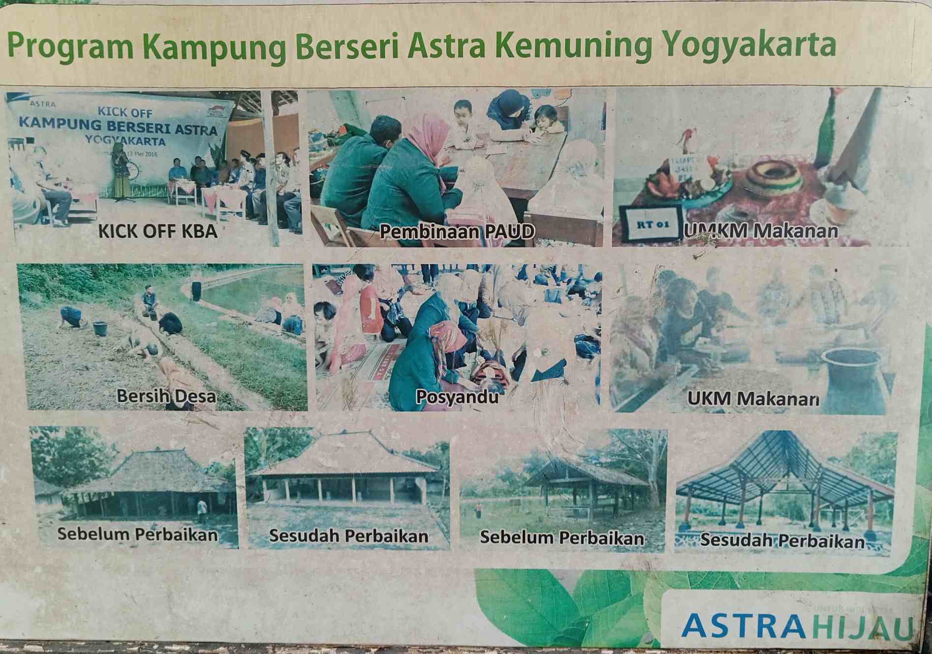 Kepala Dukuh Kemuning, Suhardi, hari Rabu 29/10/2025 menceritakan bahwa perjalanan dusunnya menjadi Kampung Berseri Astra berawal dari pengajuan proposal ke Universitas Gadjah Mada (UGM) melalui program penanaman 10.000 pohon di lahan pendidikan. Dari sinilah Kemuning kemudian ditetapkan sebagai salah satu Kampung Berseri Astra pada tahun 2016.