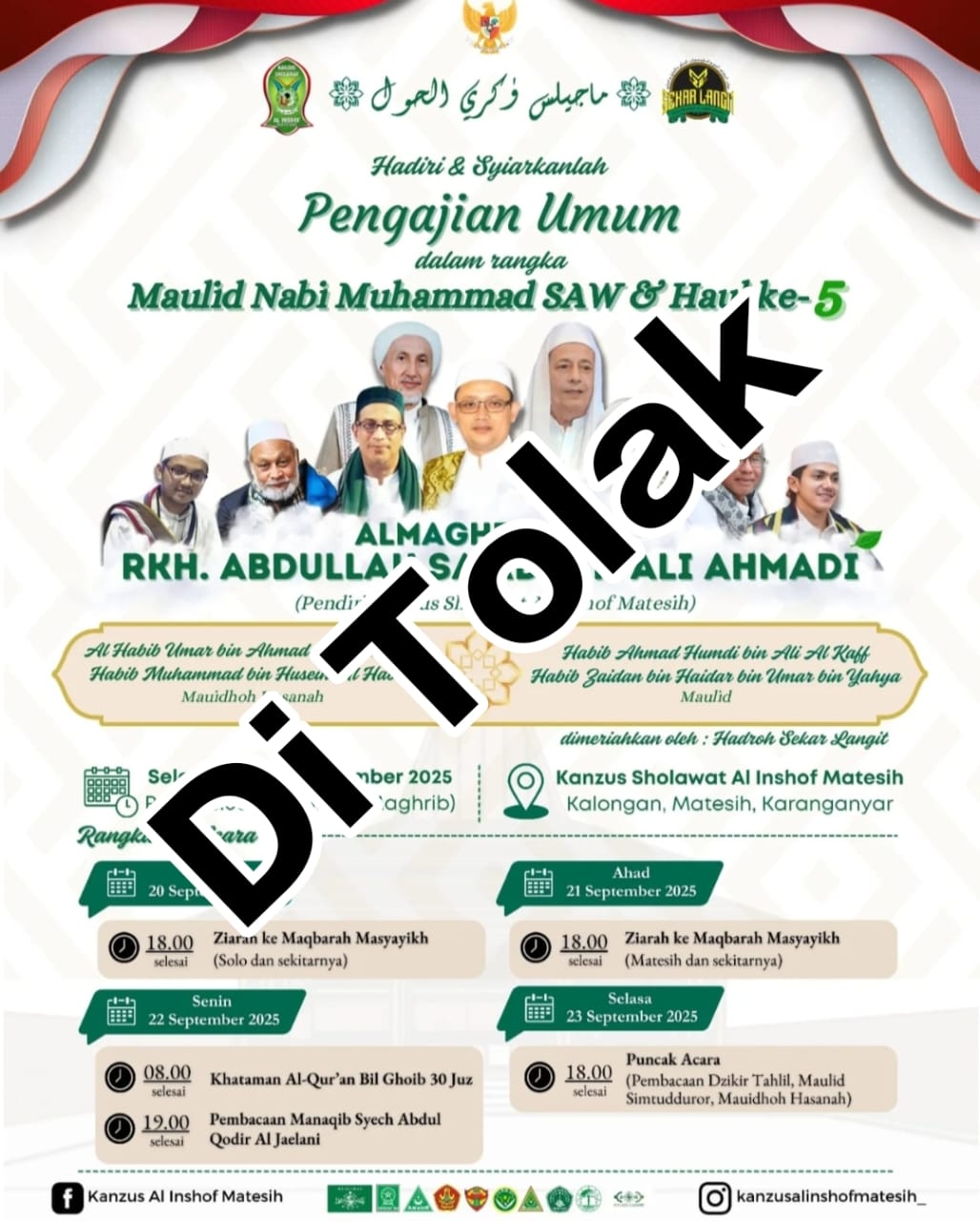 MCI – Karanganyar, DIY | Pimpinan Daerah Perjuangan Walisongo Indonesia (PD PWI) Kabupaten Karanganyar secara resmi menyampaikan keberatan kepada Kapolres Karanganyar terkait rencana kehadiran sejumlah tokoh yang dikenal dengan sebutan Habib dalam acara Maulid Nabi Muhammad SAW dan Haul ke-5 Almarhum RKH Abdullah Sa’ad bin Ali Ahmadi. Acara tersebut dijadwalkan berlangsung pada Selasa, 23 September 2025, pukul 18.00 WIB di Kanzus Sholawat Al Inshof, Dusun Kalongan, Kelurahan Matesih, Kecamatan Matesih, Kabupaten Karanganyar.