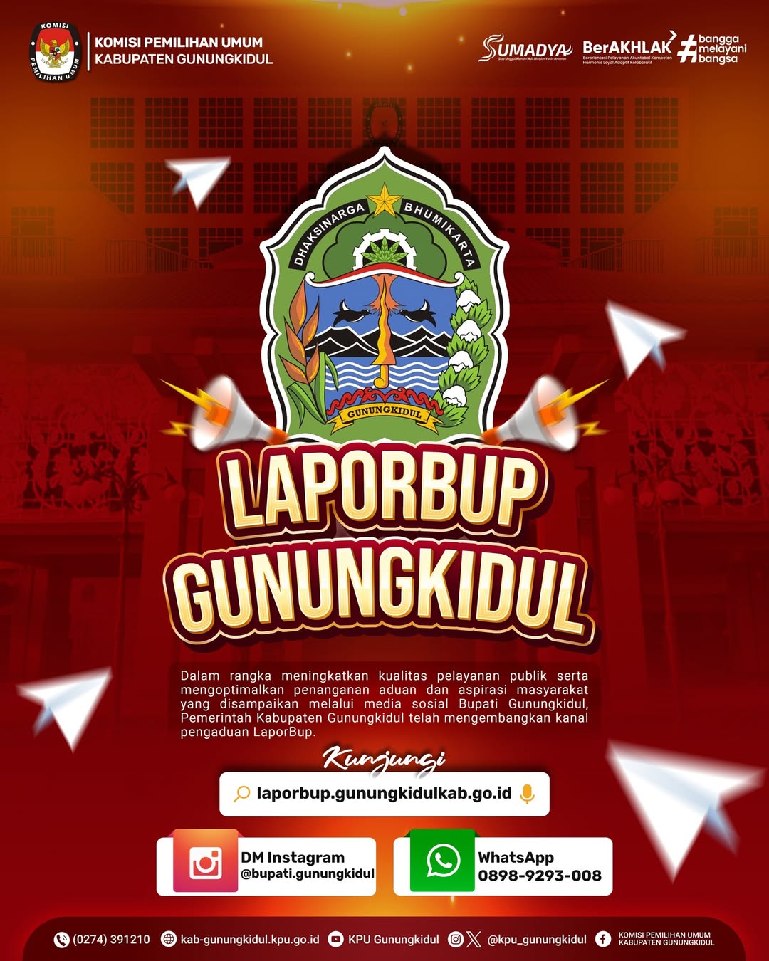Adapun masyarakat dapat mengirimkan aduan melalui WhatsApp di nomor 0898-9293-008 atau melalui pesan langsung (Direct Message) akun Instagram resmi @bupati.gunungkidul. Kanal ini diharapkan menjadi jembatan komunikasi yang efektif antara pemerintah dan masyarakat.