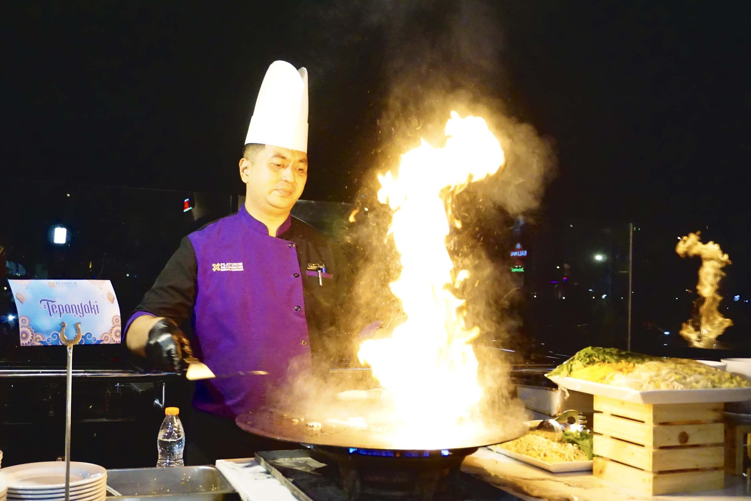 Rangkaian acara kemudian berlanjut ke The Infinity Skybar, rooftop lantai 10 yang menjadi daya tarik utama hotel. Di venue ini, para tamu menikmati Live Cooking Special Ramadan Menu yang dipersembahkan langsung oleh Executive Chef John Tiolemba.