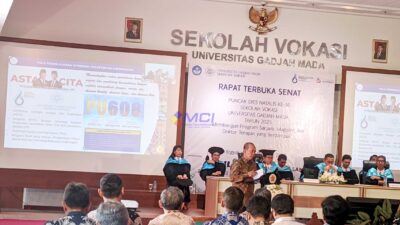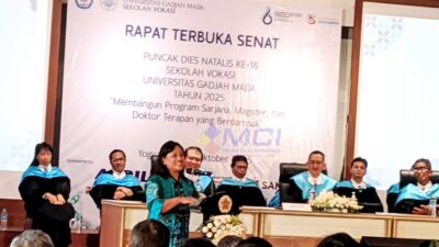 MCI – Yogyakarta, DIY | Sekolah Vokasi Universitas Gadjah Mada (SV UGM) menggelar Rapat Terbuka Senat sebagai puncak peringatan Dies Natalis ke-16 pada Senin (27/10/2025) di Gedung Teaching Industry Learning Center (TILC) UGM. Kegiatan ini mengusung tema “Membangun Program Sarjana, Magister, dan Doktor Terapan yang Berdampak” dan dihadiri oleh Direktur Jenderal Sumber Daya Air Kementerian Pekerjaan Umum, Dr. Dwi Purwantoro, S.T., M.T., yang juga merupakan alumnus UGM.