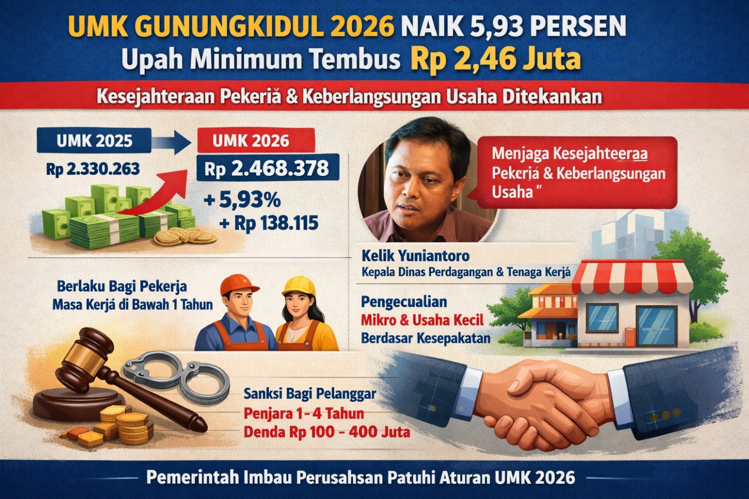 Penetapan UMK ini disampaikan oleh Kepala Dinas Perdagangan dan Tenaga Kerja Kabupaten Gunungkidul, Kelik Yuniantoro, sebagai bagian dari kebijakan pengupahan yang bertujuan menjaga keseimbangan antara peningkatan kesejahteraan pekerja dan keberlangsungan dunia usaha, sekaligus menyesuaikan dengan kondisi perekonomian daerah.